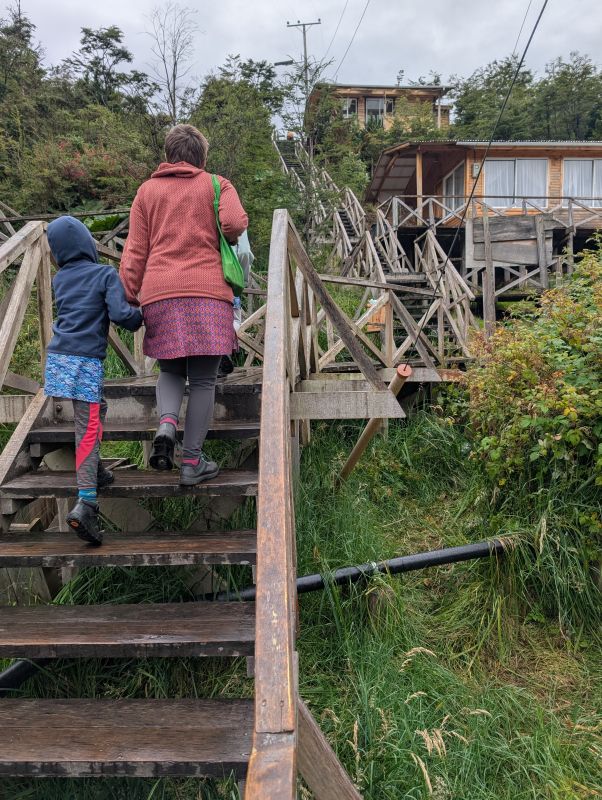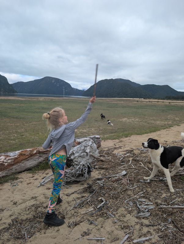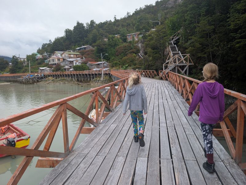 We only spent one rest day in Caleta Tortel, but it was delightful. We walked the entire length of town as a family, accompanied by three friendly dogs (the dogs essentially serve as tourist guides). The girls named them ‘Blackfur’, ‘Patches’, and ‘Oreo’. We walked all the way down to the beach, where H threw sticks for Oreo.