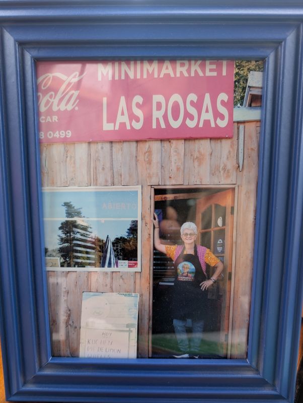 It was more rich agricultural land today. After 16 km of riding we stopped at the minimarket A mentioned for an early lunch. It was really a special place. First, we were greeted by a pack of five rat terriers. Then the owner came out wearing an apron with her own picture on it! She directed us to park the bikes alongside her shop and welcomed us inside. She bustled around taking care of everyone that came through. We ate delicious empanadas and Daisy even got to drink an espresso.