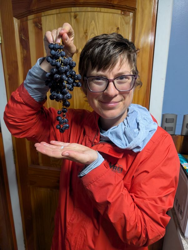 A: Breakfast: nutella, eggs, yogurt. Delicious. Morning: we left and rode for a long time with the clouds. Lunch: In restaurant, completos, chicken potato soup, and fries. Afternoon: we rode more, making it to town and then hung at our place. Dinner: salmon burger, carrot, bad other fish burger, pasta, ketchup, and the desert cake no one liked. Snack: (before lunch) salt and vinegar potato chips, cheesy chips, chocolate snack bag, water. Distance: 75 kilometers, 4 and a half hours.