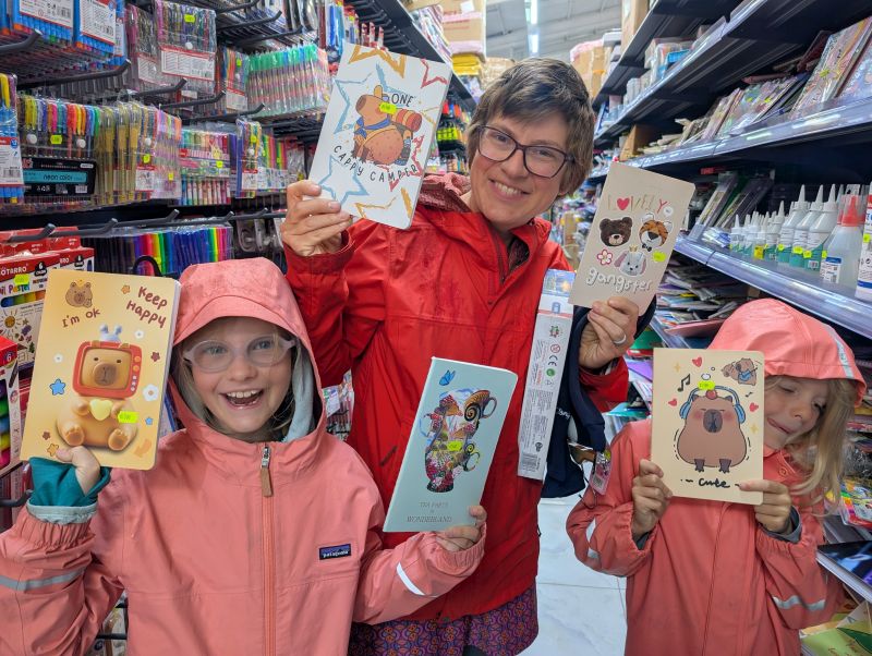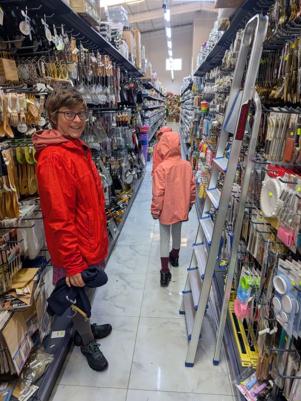 We didn’t let that stop us from getting a few chores done though! At a Mall Chino (“Chinese Mall”) we found some fuzzy/warm pants for H, which we will put to good use in a few days when it gets cold. That store was amazing because it was full of anything and everything, from hardware store items, to boba tea, to dishware, to clothes, to arts and crafts. And, as you can guess, all of it has come directly from China. We had an interesting selection of small notebooks to choose from for Daisy to use as her new journal. We also bought a 1000-piece puzzle to pass the time in our cabin as the rain continues.