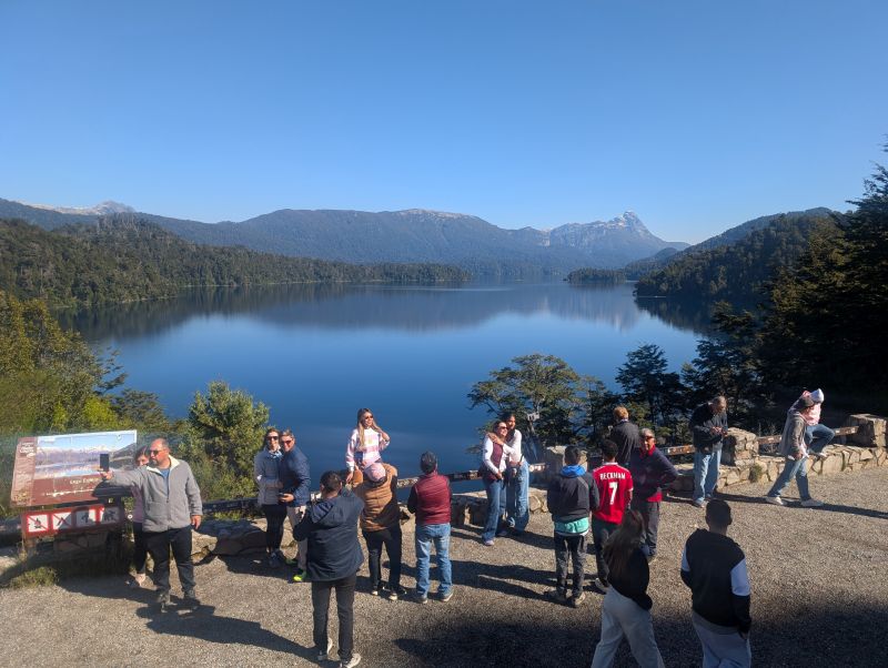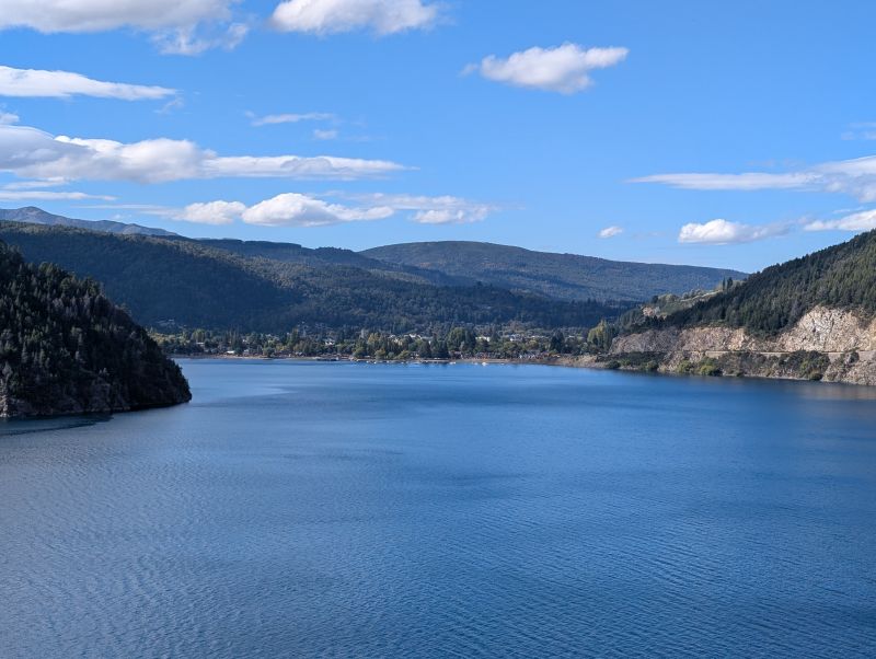 After the divided stream we started a long descent towards San Martin de los Andes – a tourist town that reminded us of Big Bear Lake in California.  The descent was spectacular, and even more remarkable was how warm the wind was as we got close to town.  No one needed to bundle up.  Suddenly we emerged onto the shores of Lake Lácar with the brilliant sun shining.  On the far side of the lake we could see deep into the Andes.  On the other was the hopping tourist town.  The road along the lake shore was packed with people out walking and enjoying the view.  Honestly, it was pretty spectacular and we were a bit shocked.