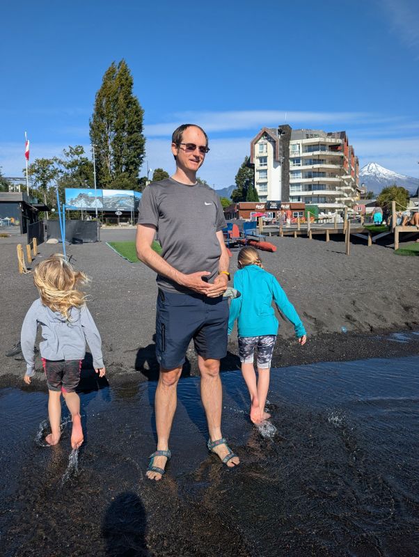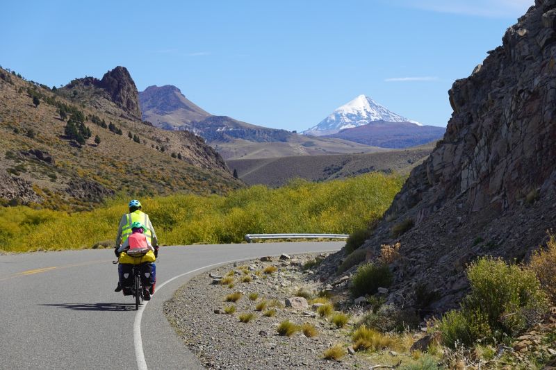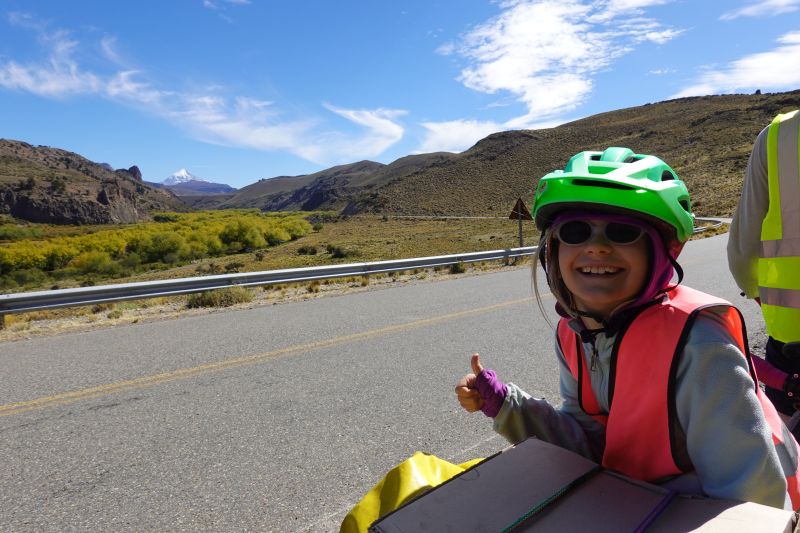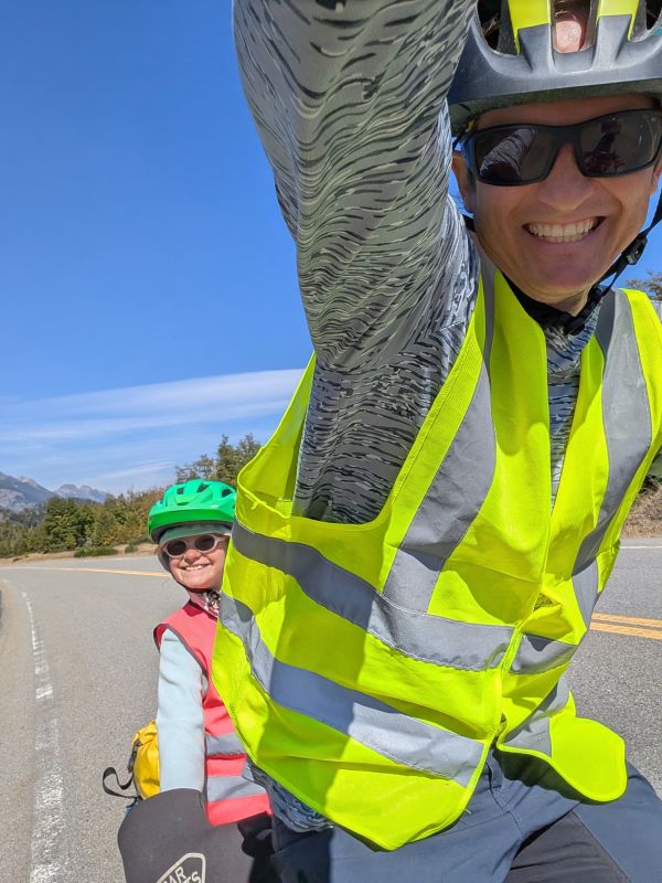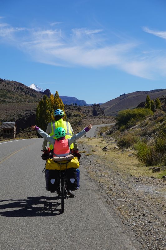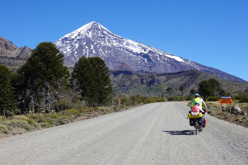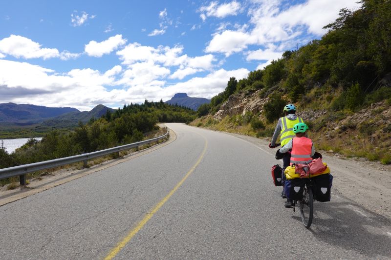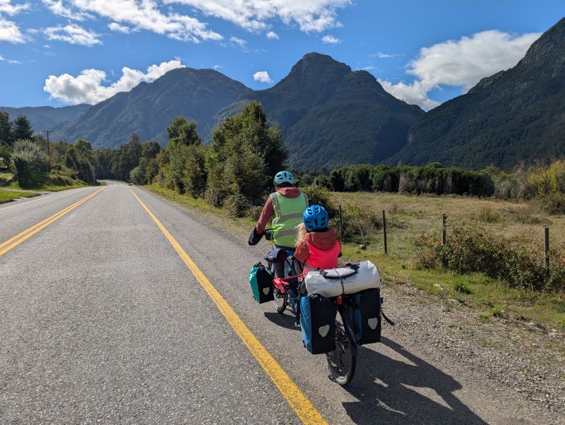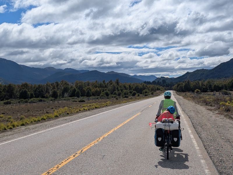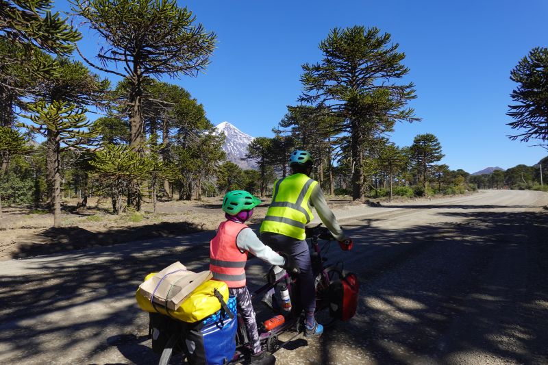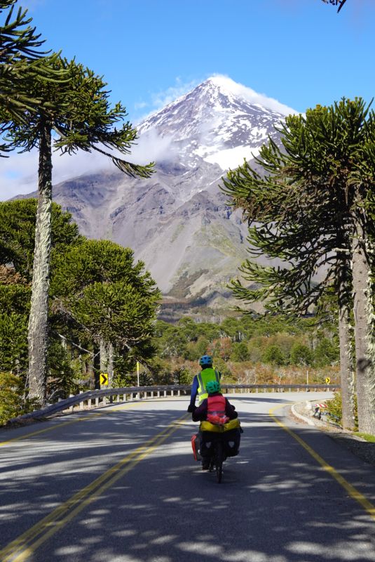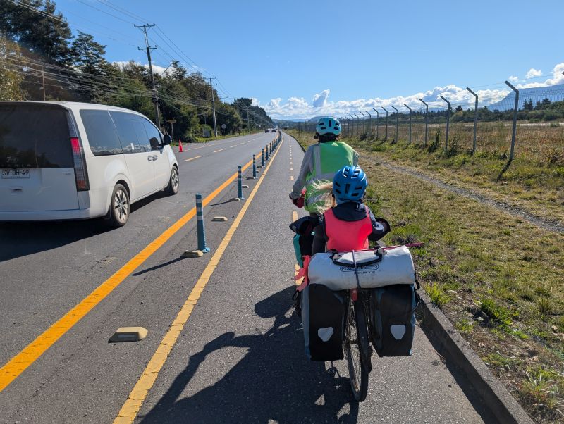 With over 3,000’ to descend we zipped down past the clouds and around a lot of tight curves.  We emerged from the clouds and mountains to find ourselves in a flat river valley.  We would spend the rest of the (long) day riding along the flat road towards the big fancy city of Pucón.  Happily, when we got close and traffic got busy a separated bicycle path appeared and whisked us all the way downtown to our lodging.  It was quite a shock for the whole family to pedal into a bustling town resembling Boulder, CO.