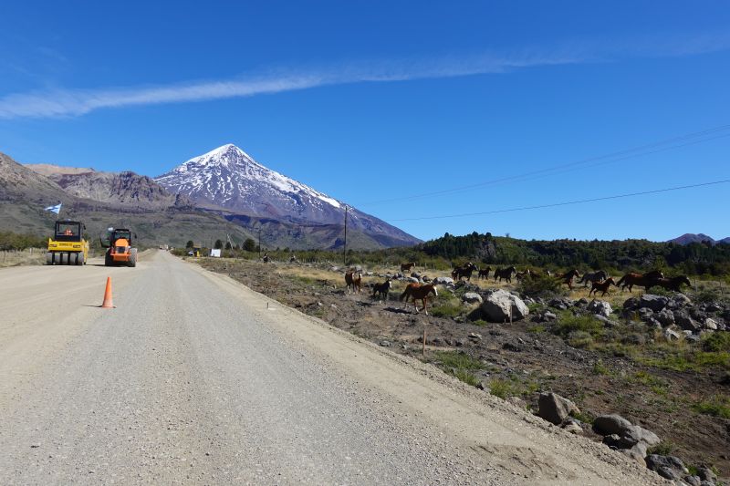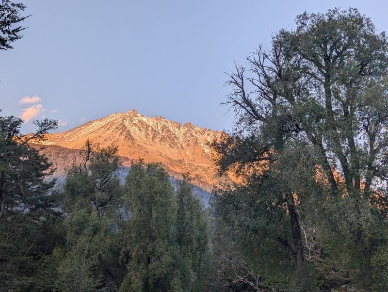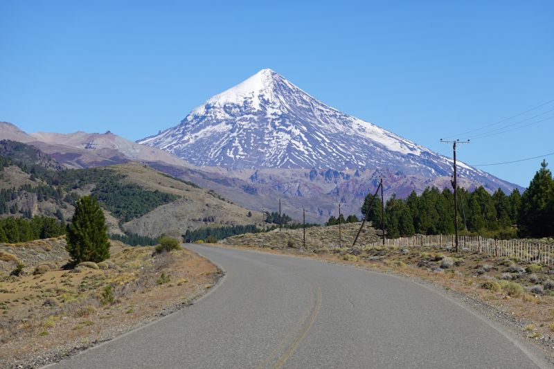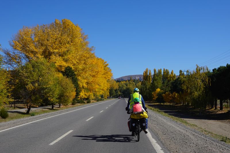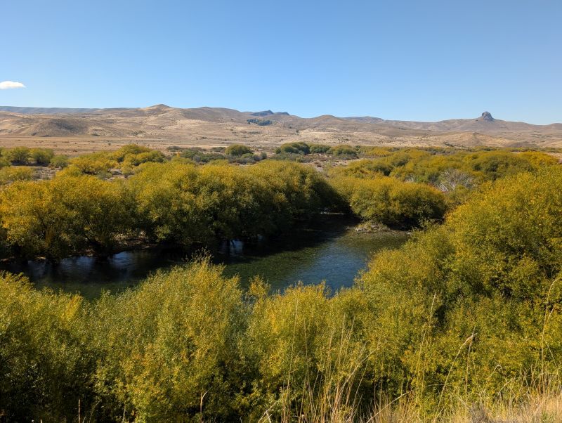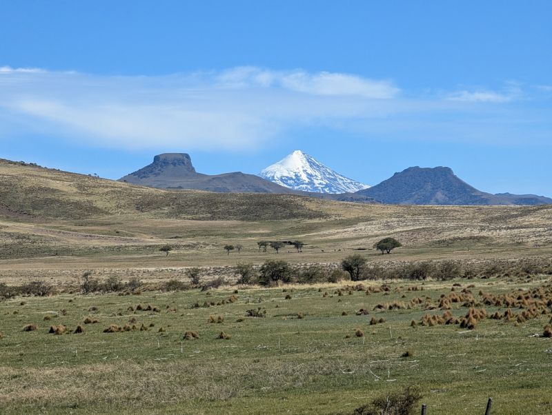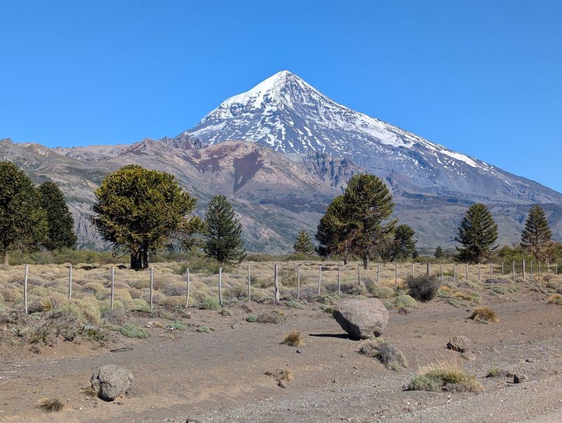 We left Junín with the blue sky above us and the fall colors blazing around us.  We turned off the main route and onto an almost traffic-free road that led back towards the Andes.  For lunch we ate leftover pizza and gazed across the big open landscape.  The volcano Lanín peaked over the hills, waiting for us.