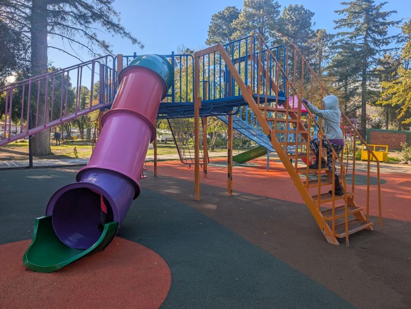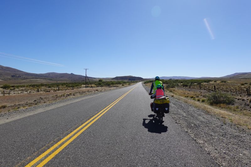 The lovely, paved bicycle path eventually became a not-quite-paved path and finally disappeared.  Then it was back to the road.  Luckily by this time there were enough huge speed bumps in the road that we were able to ride about as fast as traffic.  By the time the bumps disappeared we were able to duck off on a side road.  We wandered through a little Argentine town that truly didn’t have a whisper of tourism.  It was mostly gravel roads and dirt sidewalks, but there was also a tidy plaza and kids walking around.
