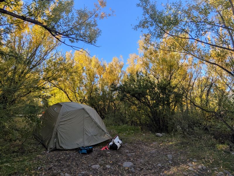 We decided to camp near a small bridge about 2km off route.  It was down a gravel road past a quarry that was busy with dump trucks making trips up the pass to redo the road near the border.  Our intended campsite was in a stand of glowing yellow trees next to a river, and when we rolled up we found a group of fly fishermen drinking mate.  We asked if they were planning to spend the night, but they were just there to stage their fishing gear.  They were very friendly, on a ten-day family fly fishing trip.  We set up our tent and used their camping table for dinner while they went out to fish.  It was an incredibly picturesque spot to spend a (cold!) night.