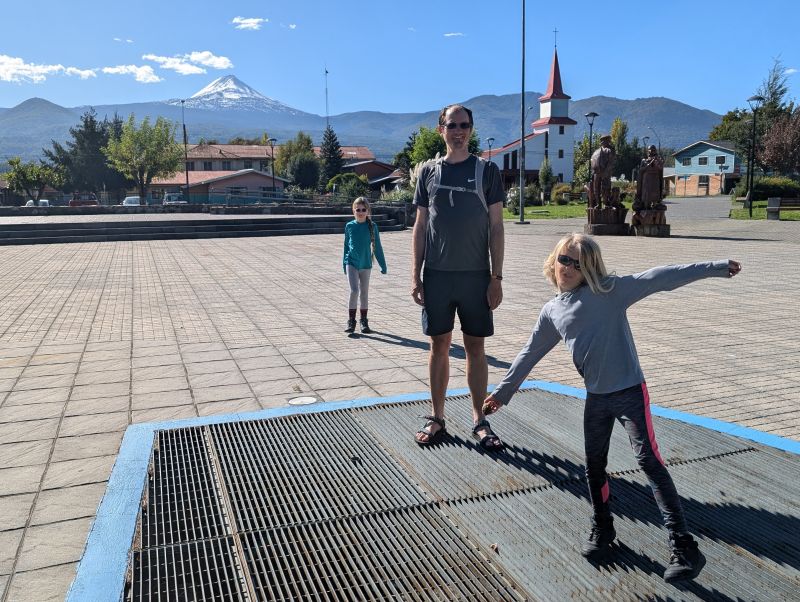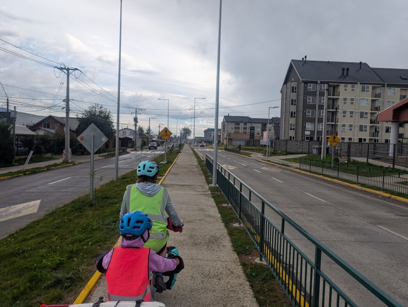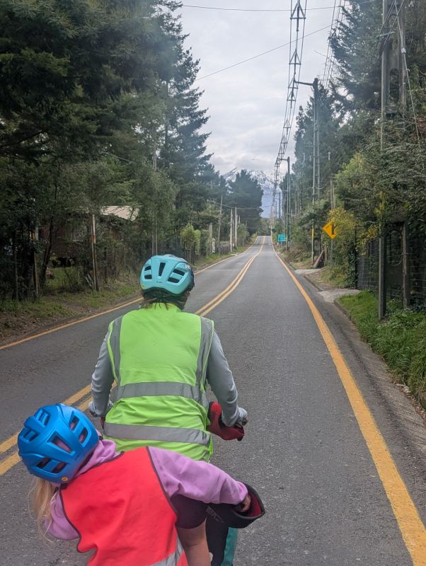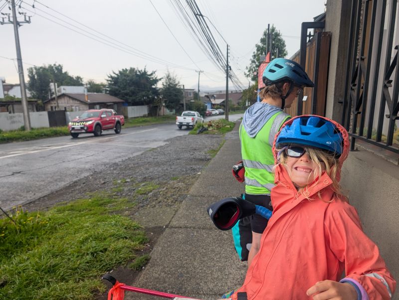 As we entered Villarrica it started to rain. Of course, despite the 10% chance forecast, after all the Philtron family was riding. We were happy to have a nice separated bicycle path that lead us toward the center, and then many separated bicycle paths to navigate. It was actually quite remarkable to have so much bicycle infrastructure. We enjoyed it!