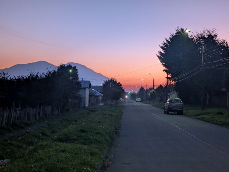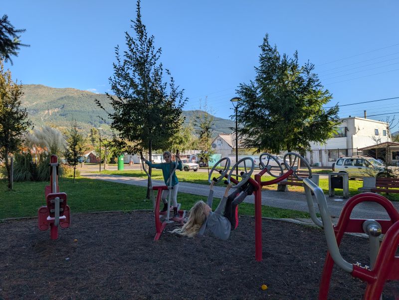 Our destination, Melipeuco, is the last tourist output before Conguillio National Park. It has everything you could need, mostly along the one main street through town. I remember this town feeling dusty and sparse when we came through eleven years ago, but my impression this time was different. I like it. It has a perfect grid for a layout, and everyone is a few blocks flat walk from a grocery store. The plaza is lovely, the neighborhoods have sidewalks and interesting houses. It was a nice place to spend a day resting.